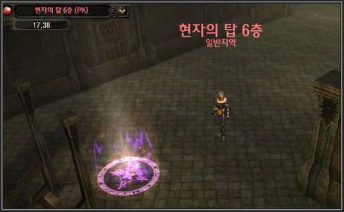 좌측의 그림처럼 던전과 같은 일반 지역에서는 장소의 이름이 붉은색으로 표시가 되며 캐릭터간의 전투, 즉 PK가 가능 합니다.