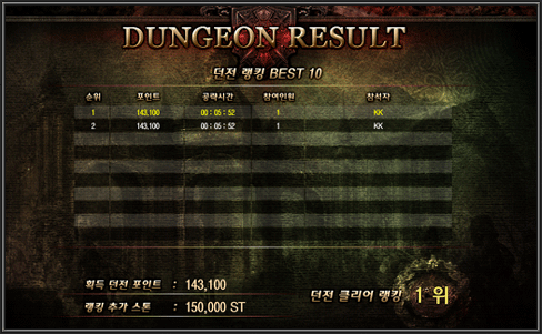 획득 던전 포인트에 의해 던전 완료한 파티나 개인의 순위를 정하게 됩니다. 던전에 참여한 인원이 적을 수록 포인트는 높아지며, 공략시간이 짧을 수록 높은 포인트를 획득 할 수 있습니다.