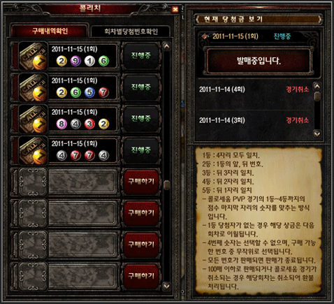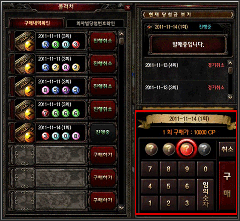 - 현재 당첨금 보기 창의 콜리치 진행 상태가 진행중 인 경우 구매가 가능합니다.