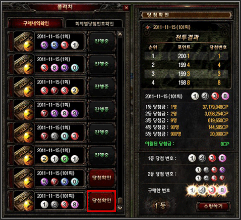 초기 콜리치 정보창에서 회차별당첨번호확인 탭을 통해 과거 당첨번호와