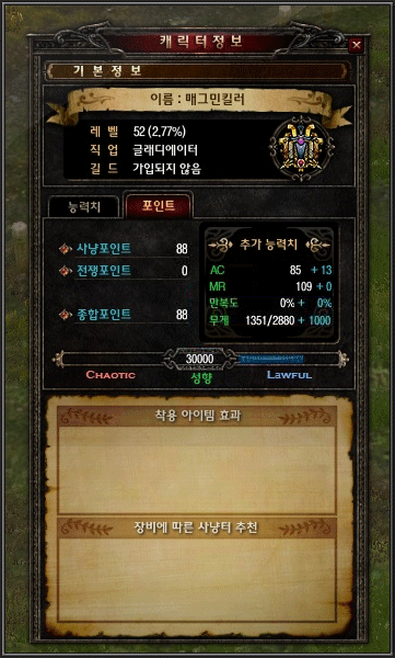 캐릭터 정보창(단축키 C)은 캐릭터의 이름, 길드 소속, 레벨 및 경험치, 직업의 정보와 능력치 (힘, 민첩, 지능, 건강) 정보, AC, MR, 성향치 등의 정보도 함께 확인할 수 있습니다.