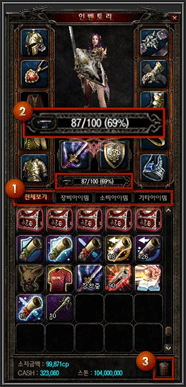 ① 인벤토리는 장비아이템, 소비아이템, 기타아이템으로 구분탭이 있어 해당 구분탭을 마우스로 클릭하면 소지하고 있는 전체 아이템 중에서 해당 탭에 속하는 속성의 아이템들만 구분하여 확인 할 수 있습니다.