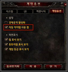 자동 아이템은 물약류와 귀환 주문서로 구분됩니다.