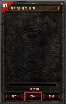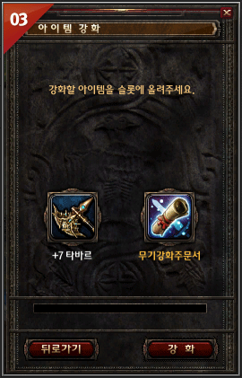 STEP 03. l 강화할 아이템과 강화주문서가 등록된 모습입니다. 강화 버튼을 누르면 강화가 시작됩니다.