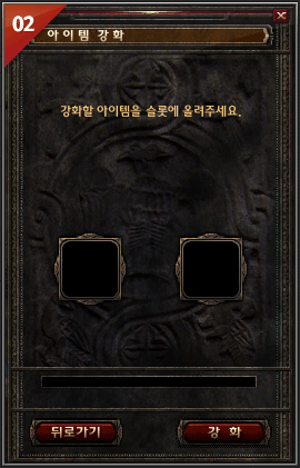 STEP 02. l 강화를 선택하면 두개의 슬롯창이 보입니다. 강화할 아이템과 강화주문서를 드래그, 더블클릭 또는 우클릭으로 슬롯창에 등록할 수 있습니다.