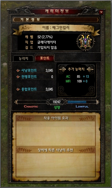 가까워 질수록 사망 시 아이템 드랍 확률이 늘어납니다. 다른 캐릭터를 강제공격하여 죽였을 때 성향치가 Chaotic으로