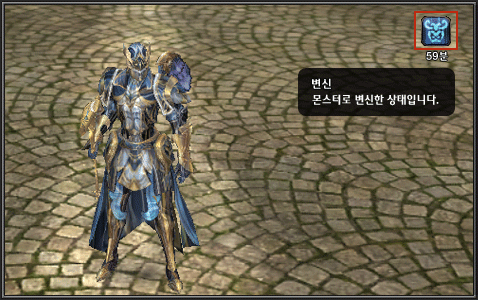 변신 막대, 변신 주문서를 사용하여 캐릭터의 외형을 변신시킬 수 있습니다. 변신 상태일 때 화면 오른쪽에 아이콘과 남은 지속시간이 표시되며, 아이콘이 사라지기 전까지는