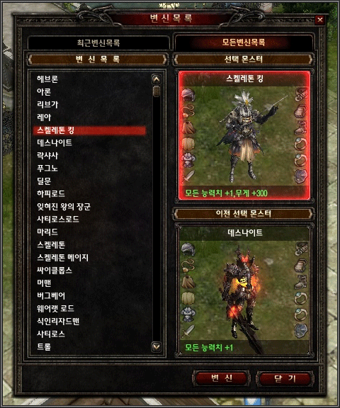 레벨이 높아질 수록 변신할 수 있는 몬스터의 종류가 다양해지며, 추가로 이로운 효과를 받을 수도 있습니다. 변신 막대를 클릭한 후 캐릭터를 선택하면, 변신할 수 있는 몬스터 중 하나로 랜덤하게 변신됩니다. 변신 반지를 착용한 상태에서 변신 막대를 사용하거나, 변신 주문서를 사용하면 변신목록창이 활성화되고 모든 변신가능한 목록을 보여줍니다. 변신 목록창에서 변신할 수 있는 몬스터 중 하나를 직접 선택해 변신할 수 있습니다. 단, 조건에 미치지 못하는 변신 종류의 경우 회색 글씨로 표시합니다.