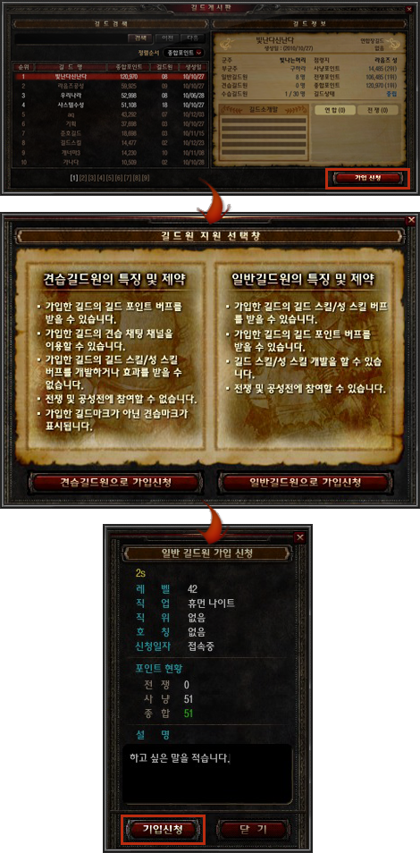 아래의 두가지 방법으로 길드 가입을 신청할 수 있습니다. (길드 탈퇴 및 추방을 당했을 경우에는 7일이 지나야 길드 가입 신청을 할 수 있습니다.)