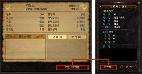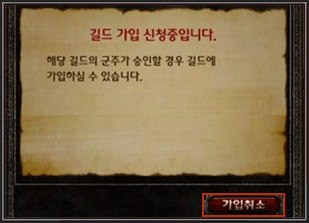 해당 길드의 군주가 가입승인 하기 전까지 가입 대기 상태가 됩니다.